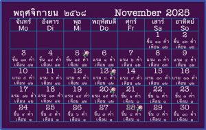 Kalenderblatt für November 2025 aus unserem Jahreskalender für 2025/2568 mit allen Zeremonien und Veranstaltungen. Sie können ihn auch herunterladen und ausdrucken.